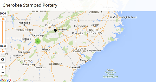 This website made it possble to pin the locations where the Cherokee Stamped Pot may have been orginally created, and the tools needed such as the wooden paddles used for the stamping technique.